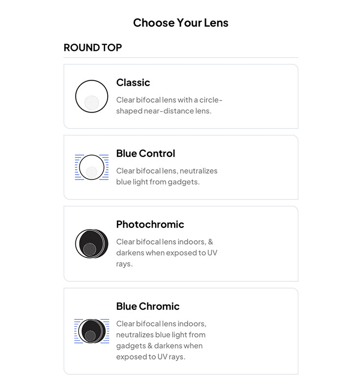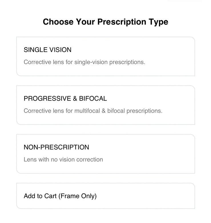 We offer various vision types whether you're a single-vision, bifocal, or progressive user.